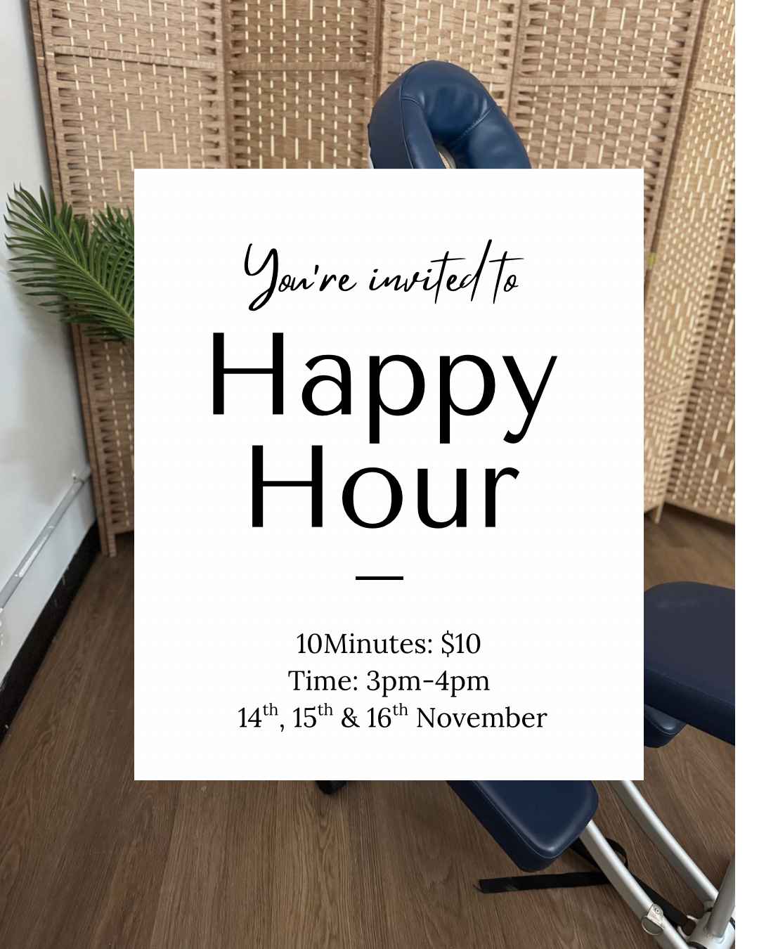 Tired after a long day, Need a minute to wind down between sites? Between the hour of 3 - 4 all 10 minute services are 50% off. Normally $20 Now $10 for happy hour.