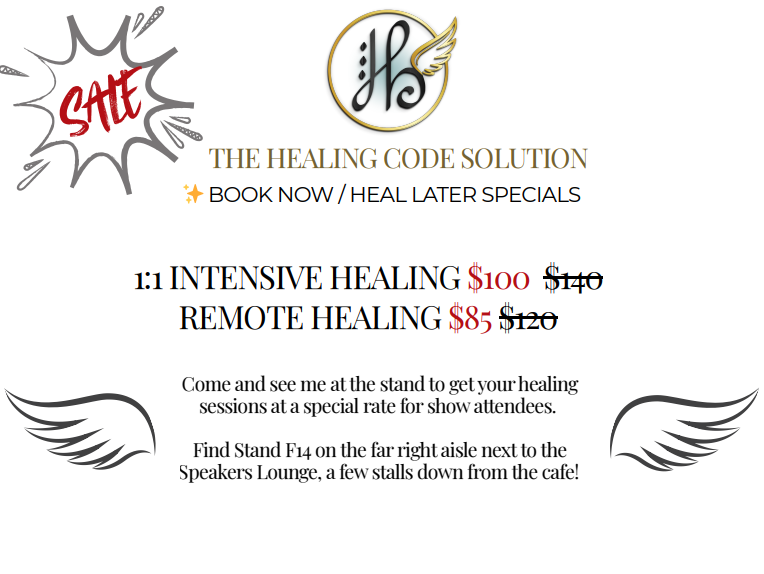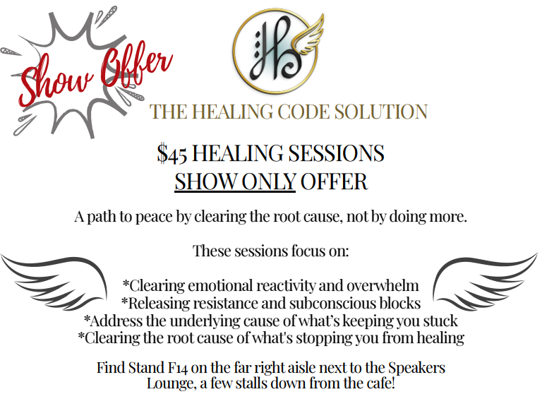 apply at booth #34 for your free 10-minute healing session from 10am ending 5pm Thursday to Sunday inclusive March 19 -22nd 2026